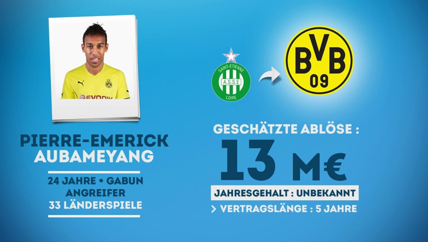 Borussia Dortmund hat für die kommende Saison den ersten Offensivspieler unter Vertrag genommen. Vom französischen Ligue 1-Klub AS St. Étienne wechselt der 24-jährige Pierre-Emerick Aubameyang zum Vizemeister. Rund 15 Millionen Euro Ablöse fließen für den Gabuner.