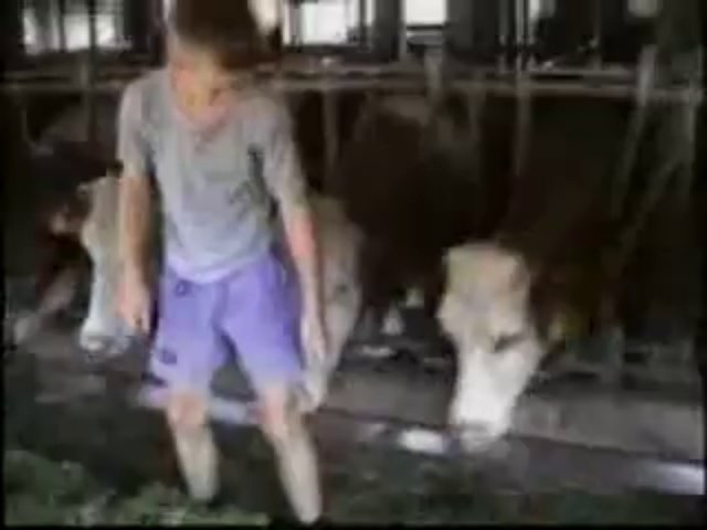 Junge im Kuhstall stellt sich vor einer Kuh ihr Kopf und die Kuh geht mit dem Kopf zwischen die Beine und hebt den Jungen hoch.
