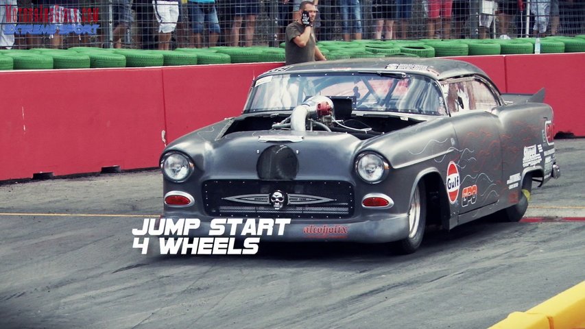 Micha Vogt mit seinem Bel Air "Monster" am Start der Public Race Days 2013 am Hockenheimring. Beim Start sind alle 4 Räder kurz in der Luft - inkl. Slow Motion Aufnahme des Starts. Dragster Racing am Hockenheimring <br />http://motorsandgirls.com/2013/08/07/micha-vogt-dragster/