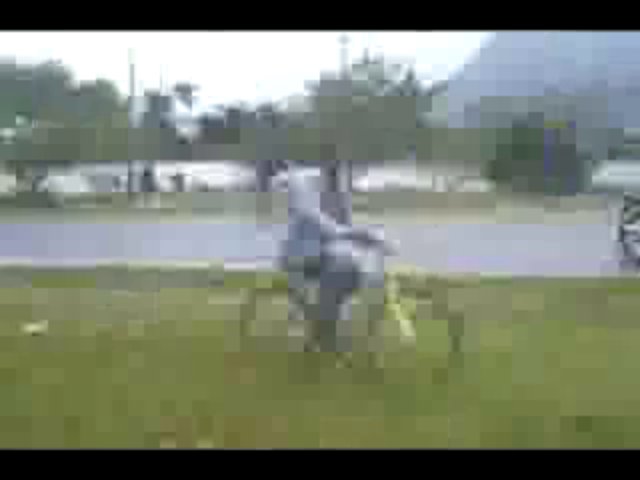 Ein Junge will mit dem Fahrrad unter einem Schild schnell durchfahren und knallt voll dagegen und fällt vom Fahrrad, aua.