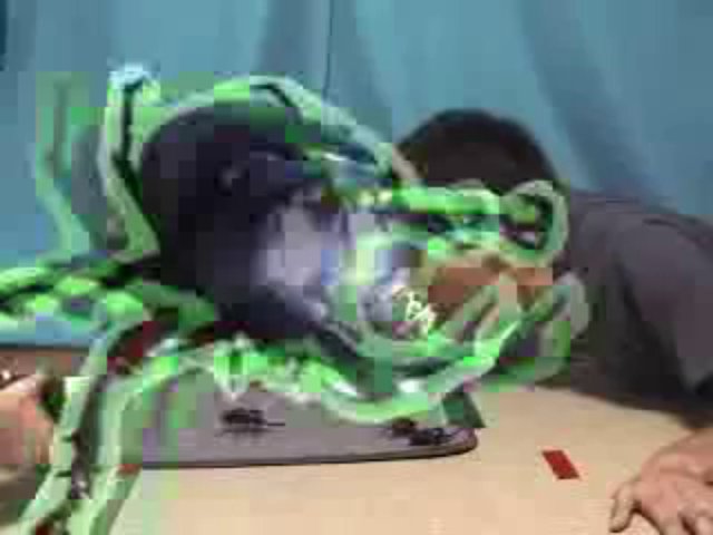 Ein Japaner lässt 5 Hirschkäfer gegen ihn Seil ziehen, er hat 5 Schnüre im Gesicht.