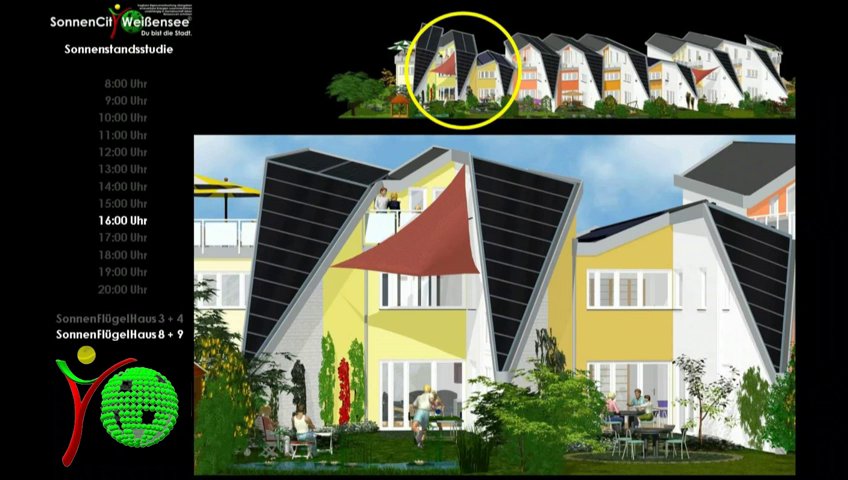 Sonnenstudie der SonnenFlügelHäuser 3 und 4 sowie 8 und 9 in Berlin Weissensee. Die Studie wurde gerechnet für den 21. Juni.