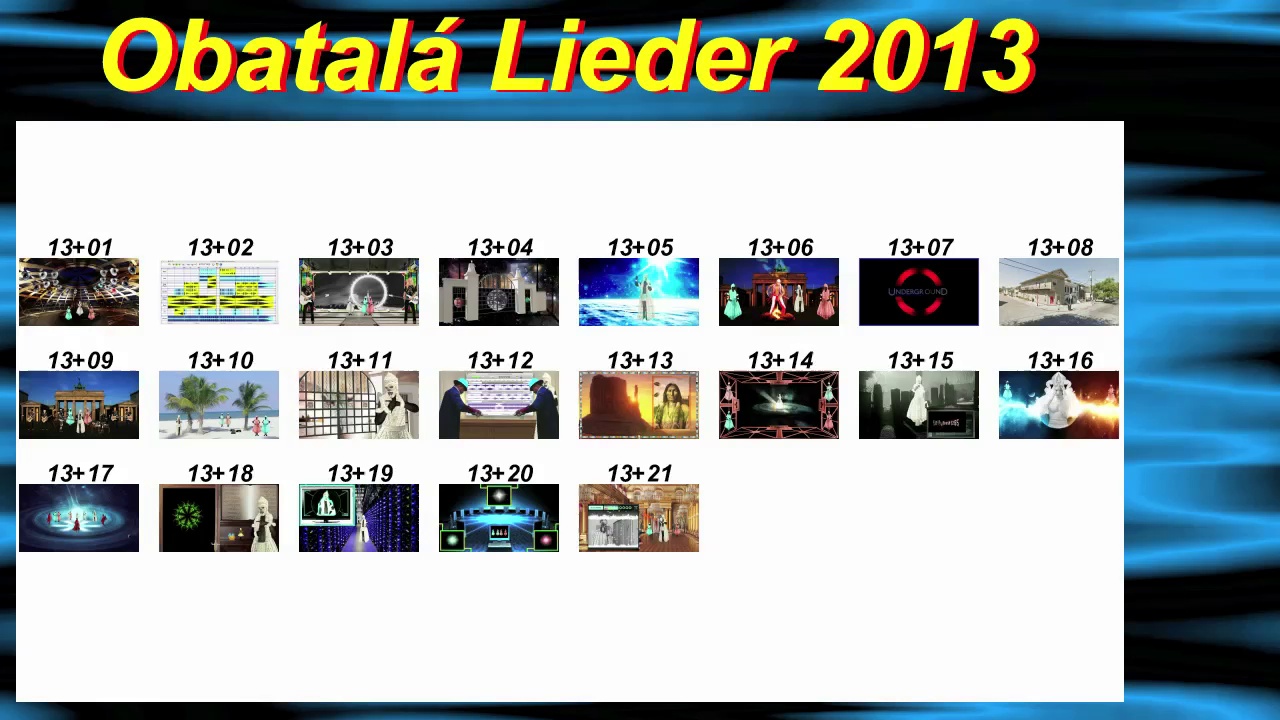This is a production of Obatalá and other artists. <br />Since there are on my channel very different styles of music, whose central theme the Obatalá are songs, there is a table of contents for each year. Each song is numbered and is alluded to briefly here. If you want to get an overview, this is the place. <br />Original title. <br />13 +00 - Table of Contents Obatalá Songs 2013 - Best of 2013 Obatalá <br /> <br />Dies ist eine Produktion von Obatalá und anderen Künstlern. <br />Da sich auf meinem Kanal sehr unterschiedliche Musik Stilrichtungen befinden, dessen roter Faden die Obatalá Gesänge sind, gibt es für jedes Jahr ein Inhaltsverzeichnis. Jedes Lied ist durchnummeriert und wird hier kurz angespielt. Wer sich einen Überblick verschaffen möchte, ist hier genau richtig. <br />Original Titel. <br />13+00 - Inhaltsverzeichnis Obatalá Lieder 2013 - Best of Obatalá 2013 <br /> <br />Mitwirkende. <br />selfybeatz85, Arno Molon, JANXEN, Iron Butterfly, Hank Marvin, Rita Ribeiro, Marko, BBA, SecretAudios, PapafiotMusic, Eloy, Torsten DJ Herzgefühle und Kok.