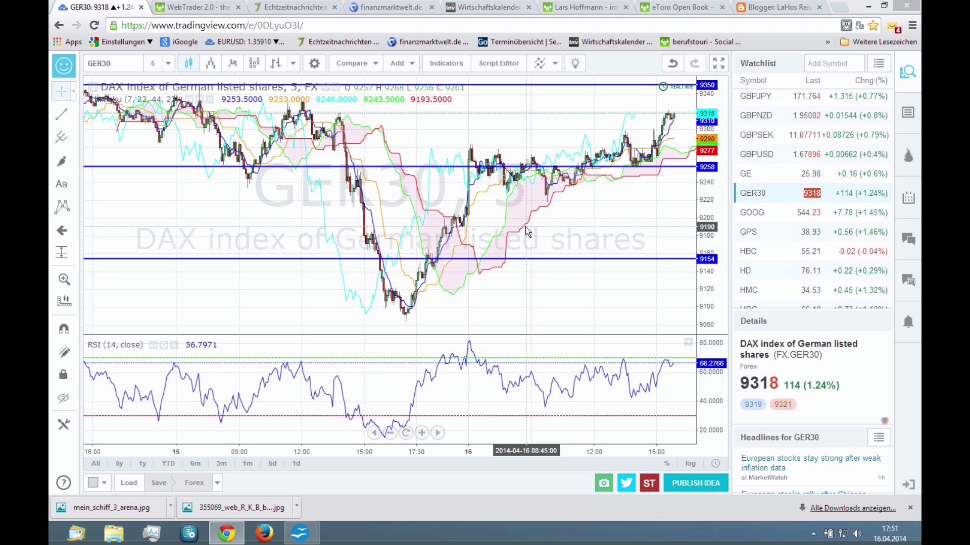 Atempause nach dem Abverkauf der letzten Tage. Ob der Boden schon erreicht wurde, ist nicht ganz klar, denn die Wirtschaftsdaten waren eher durchwachsen. Interessant war in diesem Zusammenhang eine Rede Janet Yellens nach Aufzeichnung dieser Sendung. Daraus geht hervor, dass die Fed durchaus ein Gefahr von einer Inflation deutlich über 2 % sieht. Auch der Zerfall der Ukraine hat sich eher beschleunigt als dass er abgebremst wird. <br />So bleiben für die Märkte die Abwärtsrisiken bestehen.