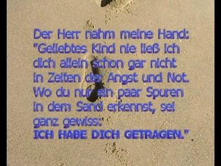 Da antwortete er: <br />"Mein liebes Kind, ich liebe dich und werde dich nie <br />allein lassen, erst recht nicht in Nöten und Schwierigkeiten. <br />Dort wo du nur eine Spur gesehen hast, <br />da habe ich dich getragen." Ein Film von Burkhard Henze 2014