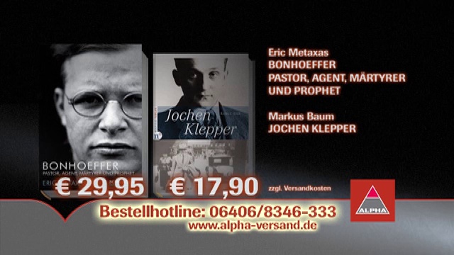 30. Januar 1933: Adolf Hitler wird deutscher Reichskanzler. Noch ahnt niemand, dass sein Regime Deutschland zerstören wird. Doch schon zwei Tage später warnt der junge Pastor Dietrich Bonhoeffer im Rundfunk vor dem „Ver-Führer". Nach langem inneren Ringen entscheidet er sich schließlich, als Doppelagent gegen Hitler zu arbeiten. Das kostet ihn 1945 im KZ Flossenbürg das Leben. Metaxas erzählt Bonhoeffers Geschichte und lässt ihn in zum Teil wenig bekannten Briefen zu Wort kommen. <br /> <br />Jochen Klepper (1903--1942) war einer der bedeutendsten christlichen Schriftsteller des 20. Jahrhunderts. Sein Roman »Der Vater« war ein Bestseller und wird immer noch gelesen, seine geistlichen Gedichte und Lieder finden sich in vielen Gesangbüchern. <br />Aber wer war Jochen Klepper; wer war der Mensch hinter diesen Werken? Das Bekannteste an seinem Leben ist ironischerweise sein tragischer Tod am 10. Dezember 1942 <br /> <br />Beide Bücher sind erhältlich unter <br />www.alpha-buch.de