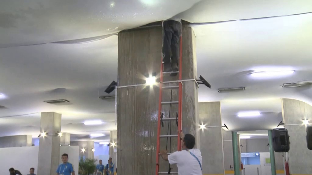 Plötzlich kam das Wasser von oben: In der Arena das Dunas setzte ein Wasserrohbruch das Mediencenter unter Wasser. Für die Partie zwischen Italien und Uruguay am Dienstag soll aber alles wieder trocken sein.