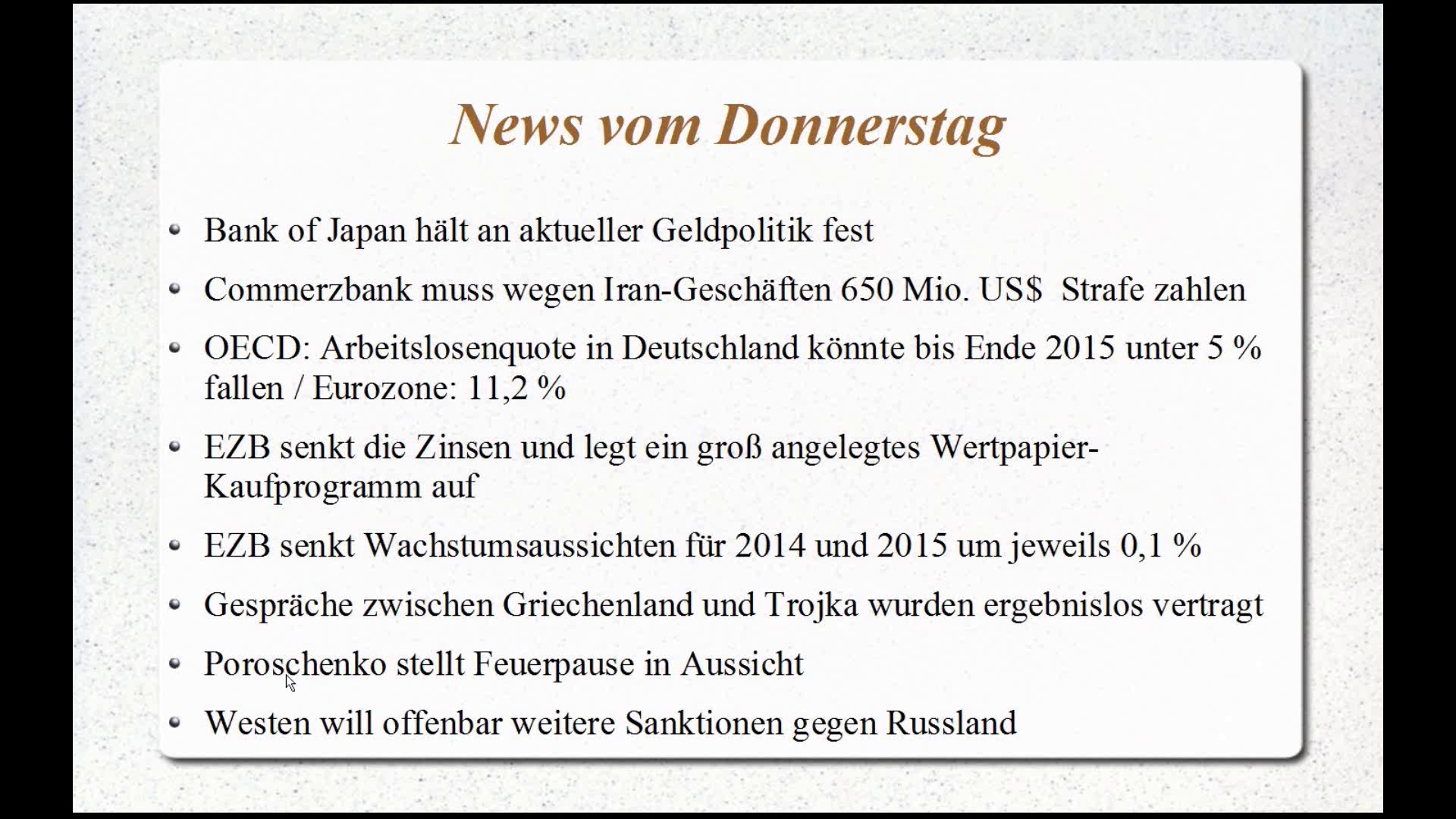 Heute mit Nachrichten zu den Zinsentscheidungen in der Eurozone, in Japan und in Großbritannien. Außerdem spielen der Eurozonen-Arbeitsmarkt, die Commerzbank, die Ukraine und die Eurokrise eine Rolle.