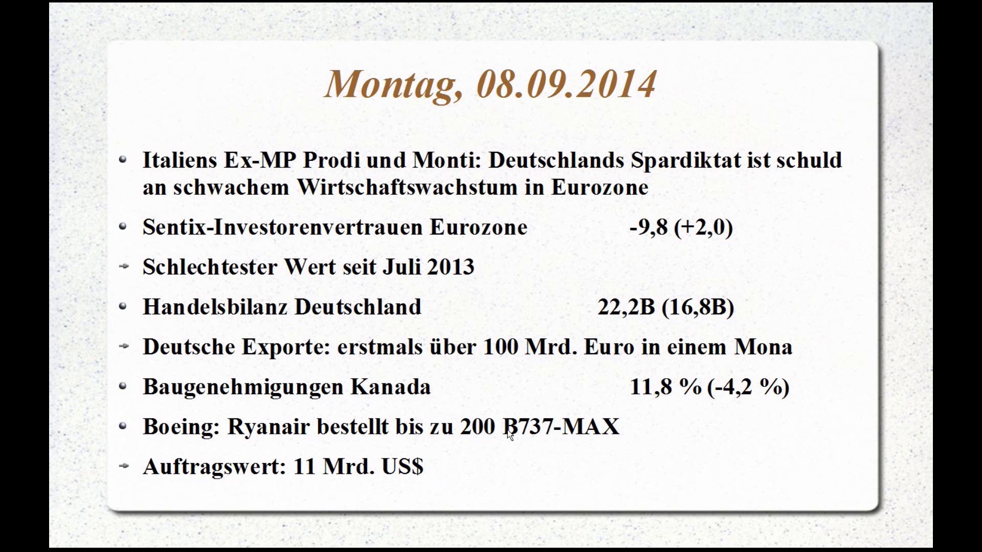 Unter anderem: <br />Schottischer Unabhängigkeitsdrang drückt Cable und FTSE <br />Ist Deutschland Schuld an der Rezession in der Eurozone? <br />Boeing freut sich über Großauftrag