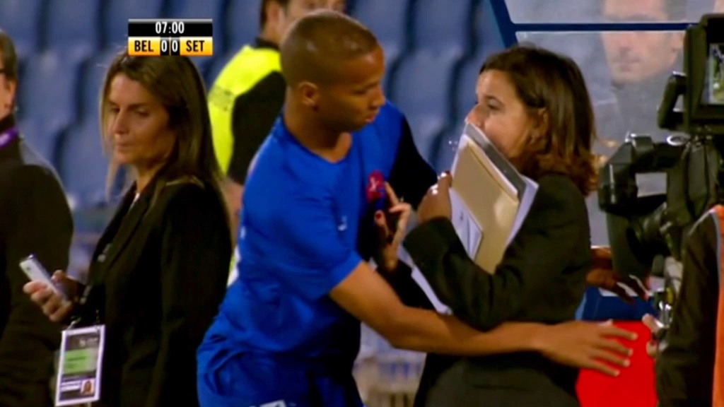 Auch als Außenstehender ist man am Fußballplatz nicht unbedingt sicher: Eine TV-Mitarbeiterin hatte Glück, dass Belenense Lissabons Deyverson ein Meister seines Fachs ist.