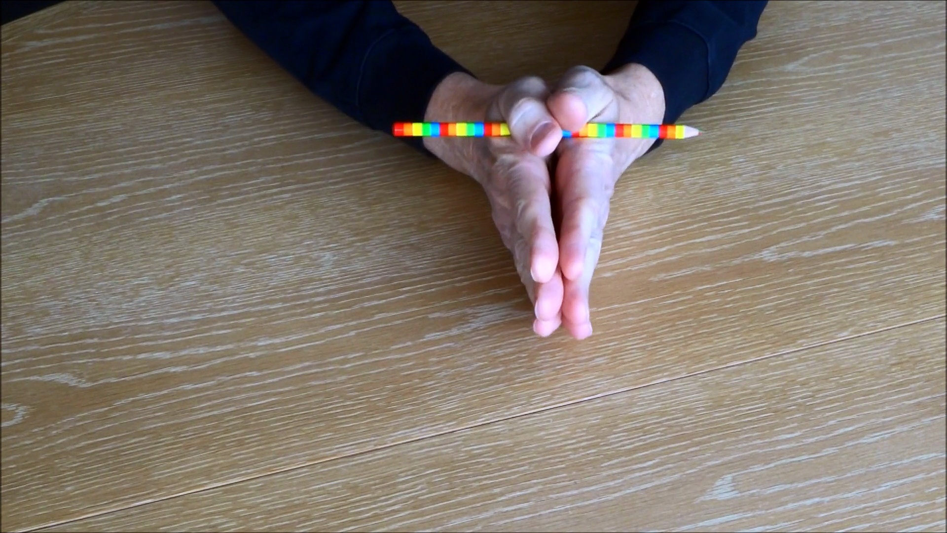 Legen Sie einen Bleistift zwischen die Daumen und über die Handfläche. Drehen Sie die Hände so, dass der Bleistift unter die Handfläche zu liegen kommt. Es geht auch umgekehrt.