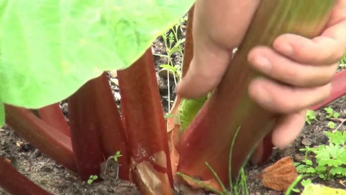 Hier kann man sehen wie Rhabarber richtig gerntet bzw. gezogen wird.