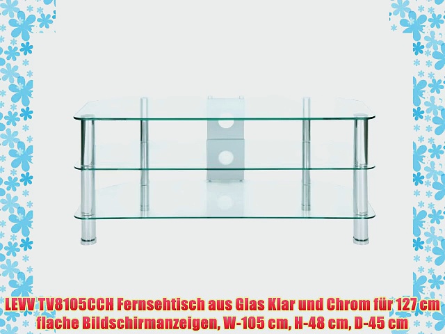 LEVV TV8105CCH Fernsehtisch aus Glas Klar und Chrom f?r 127 cm flache Bildschirmanzeigen W-105 <br />http://www.amazon.de/gp/product/B007ZQWZPU?tag=investorsukses-21 <br />Poliertes geh?rtetes Sicherheitsglas <br />Chom Tischbeine?Kabelordnungssystem?Zugstangensystem <br />Gewicht 22 kg