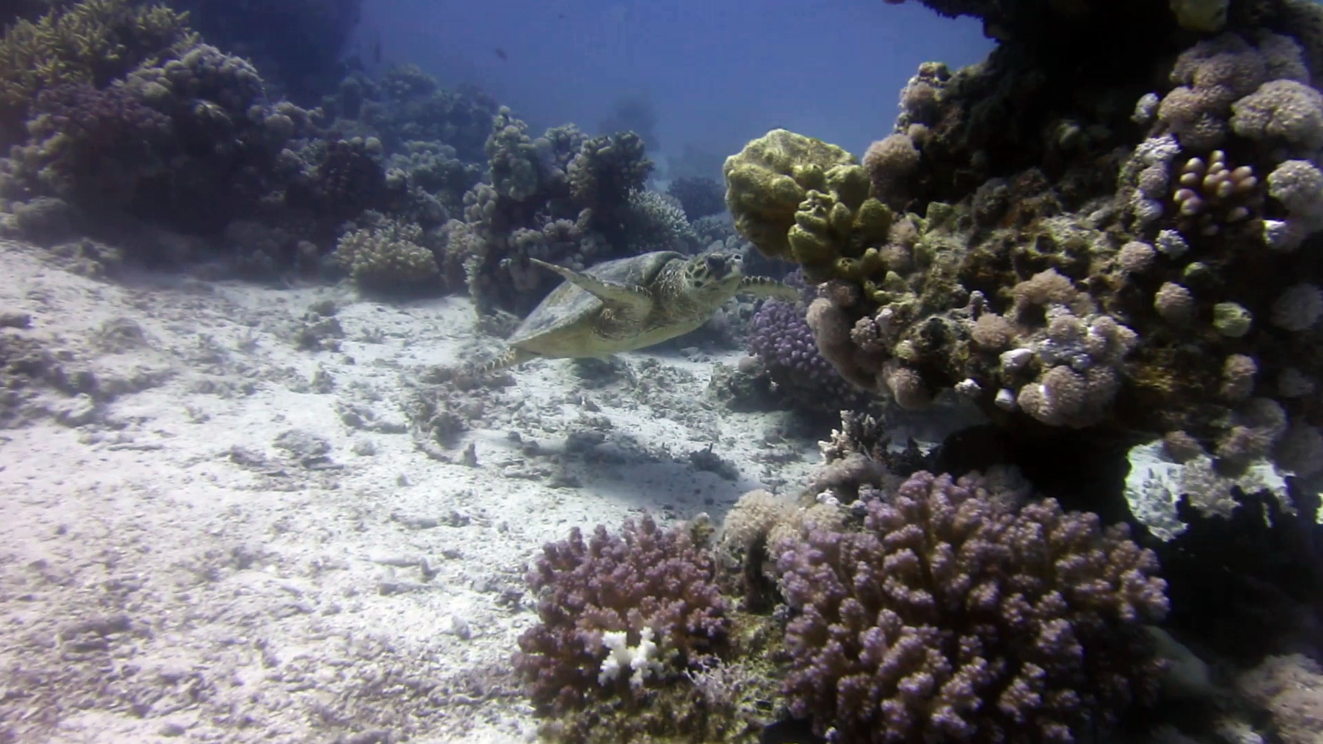 Hier ist eine Schildkröte am Tauchplatz Tobia Unus zu sehen, die sich nicht aus der Ruhe bringen lässt. Tobia Unus liegt zwischen Tobia Kebir und Tobia Soraya (Rotes Meer/Safaga).
