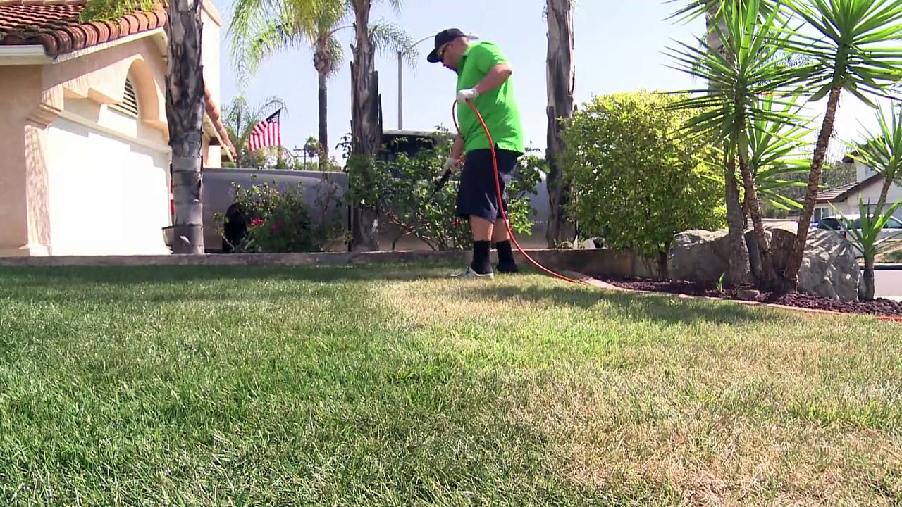 Wegen einer seit vier Jahren anhaltenden Rekorddürre beschränkt ein neues Gesetz den Einsatz von Rasensprengern in Kalifornien. Trotzdem wollen sich viele Hausbesitzer nicht von ihren geliebten leuchtend grünen Vorgärten verabschieden und greifen deshalb jetzt statt zum Gartenschlauch zur Sprühpistole. Eine Spezialfarbe namens Lawnlift verspricht einen sattgrünen Rasen für drei Monate - und ist sogar wasserfest, falls es doch mal regnen sollte.