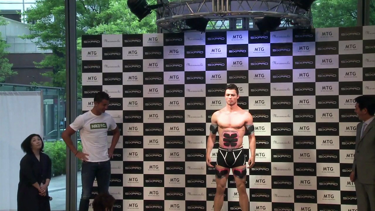 Fußballstar Cristiano Ronaldo ist bei einem Besuch in Tokio einem äußerst knapp bekleideten Doppelgänger aus Silikon begegnet. Der dreifache Weltfußballer des Jahres war in Japan, um für einen Stimulator zum Trainieren der Bauchmuskeln zu werben.