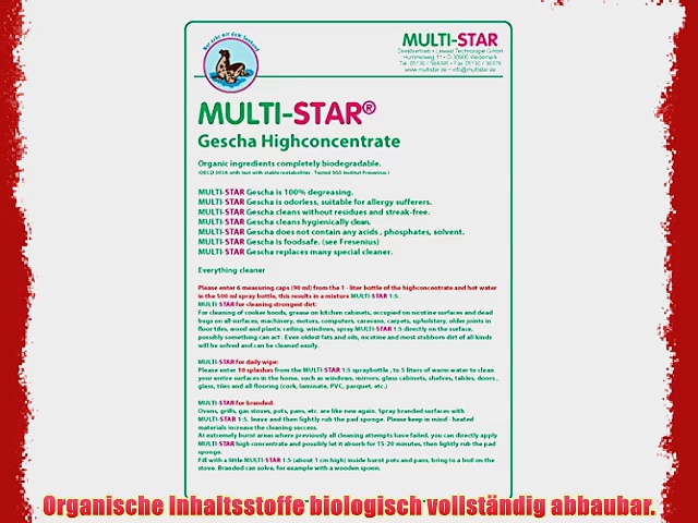 Kaufen bei Amazon.de : http://www.amazon.de/gp/product/B00A8QELWE?tag=1001consejo0f-21 <br /> <br />MULTI-STAR Gescha Hochkonzentrat Reiniger 1000ml Set <br /> <br />Organische Inhaltsstoffe biologisch vollst?ndig abbaubar <br />MULTI-STAR - ist geruchlos Allergiker geeignet <br />MULTI-STAR - reinigt r?ckstandslos und streifenfrei <br />MULTI-STAR - ist 100 entfettend <br />MULTI-STAR - enth?lt keine S?uren Phosphate L?semittel