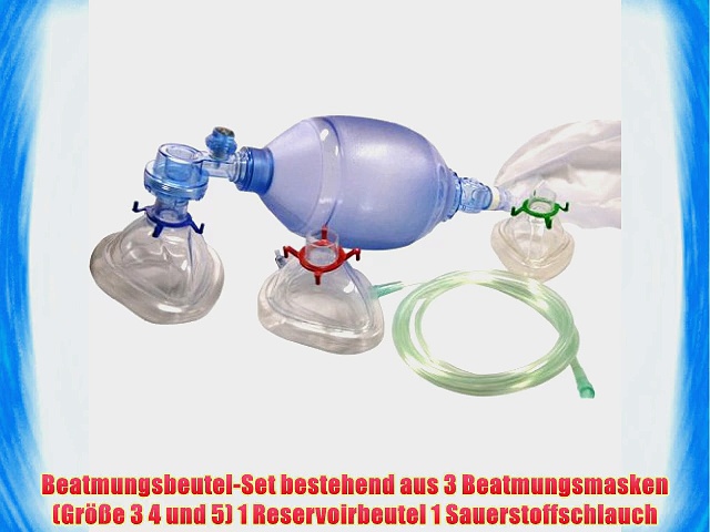 Kaufen bei Amazon.de : http://www.amazon.de/gp/product/B007JT9EMA?tag=1001consejo0f-21 <br /> <br />Beatmungsbeutel Set - 3 Masken 1 Reservoirbeutel 1 Sauerstoffschlauch <br /> <br />Beatmungsbeutel-Set bestehend aus 3 Beatmungsmasken Gr??e 3 4 und 5 1 Reservoirbeutel 1 Sauerstoffschlauch <br />Latexfrei <br />1800 ml Volumen <br />Druckbegrenzungsventil <br />Zum Einmalgebrauch