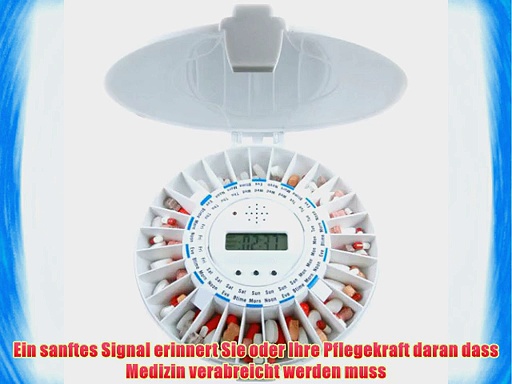 Kaufen auf Amazon.de : http://www.amazon.de/gp/product/B00FL623G2?tag=vidaextra0e-21 <br /> <br />Ivation Automatischer Tabletten-Spender und Elektronische Erinnerungshilfe f?r Medikamenteneinnahme <br /> <br />Ein sanftes Signal erinnert Sie oder Ihre Pflegekraft daran dass Medizin verabreicht werden muss <br />Einzelne F?cher f?r jede Verabreichung geben den Inhalt in der korrekten Dosierung heraus <br />28 verschlossene F?cher enthalten individuelle Dosierungen der Medizin Jedes Fach ist gro? und kann bis zu 12 Tabletten aufnehmen <br />Ein Verschlussmechanismus gew?hrt Schutz vor einer ?berdosis und verhindert den Zugang zur Medizin au?erhalb der verschriebenen Zeitpunkte <br />Ein Medikamente-Plan kann ganz einfach f?r bis zu 4 Wochen festgelegt werden Austauschbare Scheiben die es erm?glichen alternative Behandlungsprotokolle ein zwei drei oder vier Mal am Tag auszugeben