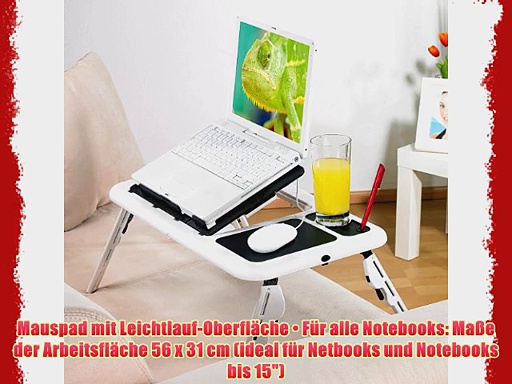 Mehr auf Amazon.de : http://www.amazon.de/gp/product/B0045IYT00?tag=planetahuer0e-21<br /><br />General Office Notebooktisch mit 2 USB-L?ftern klappbar<br /><br />Mit 2 integrierten L?ftern Stromversorgung ?ber USB Kein Kabelgewirr Aussparungen f?r saubere Kabelf?hrung <br />Extra ergonomisches Arbeiten Arbeitsfl?che kippbar Standf??e h?henverstellbar Sehr pflegeleicht L?sst sich einfach abwischen <br />Mauspad mit Leichtlauf-Oberfl?che F?r alle Notebooks Ma?e der Arbeitsfl?che 56 x 31 cm ideal f?r Netbooks und Notebooks bis 15 <br />Komfortable Extras Getr?nke-Abstellfl?che und Stifthalter <br />Reise- und verstaufreudig Zusammenklappbar auf platzsparende 28 x 31 x 35 cm