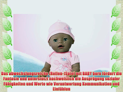 Volle Information in Amazon.de : http://www.amazon.de/gp/product/B00CGM99UW?tag=jardineriap0f-21 <br /> <br />Zapf Creation 818718 - Baby Born Interactive ethnic <br /> <br />BABY bornMarkenspielpuppe 43 cm mit acht lebensechten Funktionen <br />Das abwechslungsreiche Rollen-Spiel mit BABY born f?rdert die Fantasie und unterst?tzt nachweislich die Auspr?gung sozialer F?higkeiten und Werte wie Verantwortung Kommunikation und Einf?hlungsverm?gen <br />Ben?tigt keine Batterien <br />Umfangreiches Zubeh?r f?r ein realistisches Rollenspiel <br />Jede Puppe hat ihren eigenen Personalausweis der den M?dchen den Zugang zur virtuellen BABY born Welt er?ffnet