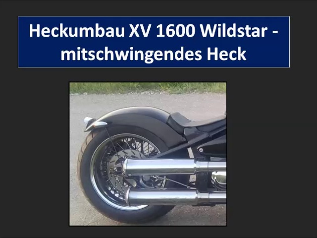 So kann bei der XV 1600 Wildstar der Fender am Heck mit relativ einfachen Mitteln mitschwingend befestigt werden. <br />Nach der Befestigung muss dieser Umbau dann per Einzelabnahme in die Fahrzeugpapiere eingetragen werden.