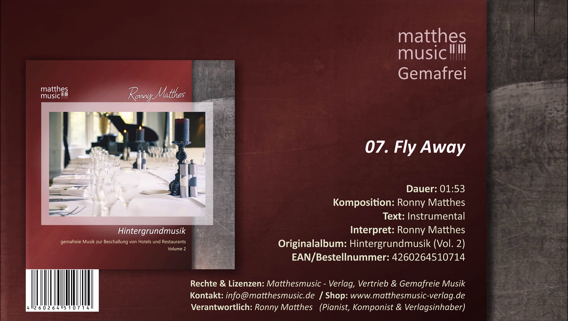 Album: Hintergrundmusik - Gemafreie Musik zur Beschallung von Hotels & Restaurants (Vol. 2) <br /> <br />Titel: Fly Away <br />Interpret: Ronny Matthes <br />Komponist: Ronny Matthes <br />Laufzeit: 01:53 <br /> <br />Label: Matthesmusic - Verlag, Vertrieb & Gemafreie Musik (http://www.matthesmusic-verlag.de) <br /> <br />Das Album bei Amazon: http://www.amazon.de/Hintergrundmusik-Vol-Gemafreie-Klaviermusik-Chillout/dp/B00XQF7018/ref=sr_1_8?s=music&ie=UTF8&qid=1440433101&sr=1-8&keywords=ronny+matthes <br /> <br /> <br />Titel Lizenzieren unter: http://www.matthesmusic-verlag.de/07-Fly-Away-Gemafreie-Klaviermusik <br /> <br />Matthesmusic - Verlag, Vertrieb & Gemafreie Musik (Inh. Ronny Matthes) <br />Ermelstraße 34 <br />01277 Dresden <br />http://www.matthesmusic.de <br />info@matthesmusic.de <br />0351-3137959