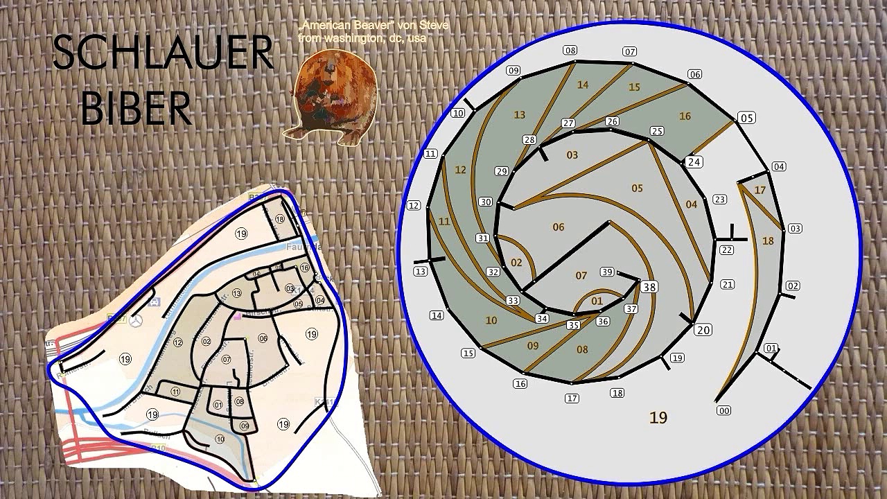 Der zugehörige Hauptfilm "2015-11-18 Dynamische Netzentwicklung" steht unter http://dai.ly/x3er2kx zur Verfügung. <br />Der "Schlaue Biber" macht sich seine Sache um einiges einfacher als sein Vorgänger "Fleissiger Biber" (http://dai.ly/x3ibjk). Während der "Fleissige Biber" sein topologisch äquivalentes Netz Kante für Kante aufbaut, begnügt sich der "Schlaue Biber" mit flächenbezogenen Nachweis <br />Nun können die Flächen unterschiedlichen Funktionen zugeordnet werden. Zuerst entstehen die Innenflächen, welche in Hellgrau angelegt sind. Danach folgt der Bereich zwischen innerem Abschluss und äusserem Abschluss. Dieser Bereich ist in einem leicht nach Grün tendierenden Dunkelgrau angelegt. Die Grüntönung bedeutet, dass der äussere Ansatz des "Muskels" dem inneren Ansatz vorauseilt. <br />Leider hat diese Purpurschnecke noch zu wenig Fleisch, um auch einen inneren radialen Ansatz zustandezubringen. <br />Beim Einfärben mit vier Farben ist es nicht ratsam, die Flächen in der Reihenfolge des Entstehens einzufärben. Vielmehr wird zunächst die Farbe des Aussenbereichs gewählt. Dann werden reihum die dem Aussenbereich benachbarten Flächen eingefärbt. Es ist leicht einsehbar, dass keine dieser Nachbarflächen die Farbe des Aussenbereichs haben darf. <br />Die gewählten Farben sind äquidistant: <br />Hue Lightning Saturation <br /> 30 70 100 <br />120 70 100 <br />210 70 100 <br />300 70 100 <br />Anschliessend verwandelt der "Schlaue Biber" in 10 Phasen Originalnetz und standardisiertes Netz in die <br />Darstellung zum Filmtitel des Hauptnetzes. <br />Diesmal wurde für den "Schlauen Biber" keine gebundene, sondern eine freie Kpmposition verwendet; eine Komposition mithin, welche nicht mehr jede Phase des Prozesses akribisch kommentiert, sondern einfach nur <br />eine passende musikalische Untermalung darstellt. Duie einizige Anforderung ist die Synchronisation mit Anfang und Ende des Clips. Die hierfür verwendete Komposition "Fleissiger Biber" (bzw. ein Aussschnitt daraus) steht für das rastlose Treiben dieses unermüdlichen Nagers. Sie weist eine entfernte Verwandtschaft <br />zu dem Bluegrass-Klassiker "Old Joe Clark" auf. <br />Das hierzu eingesetzte Instrument ist MIDI 35: Electric Bass (picked).