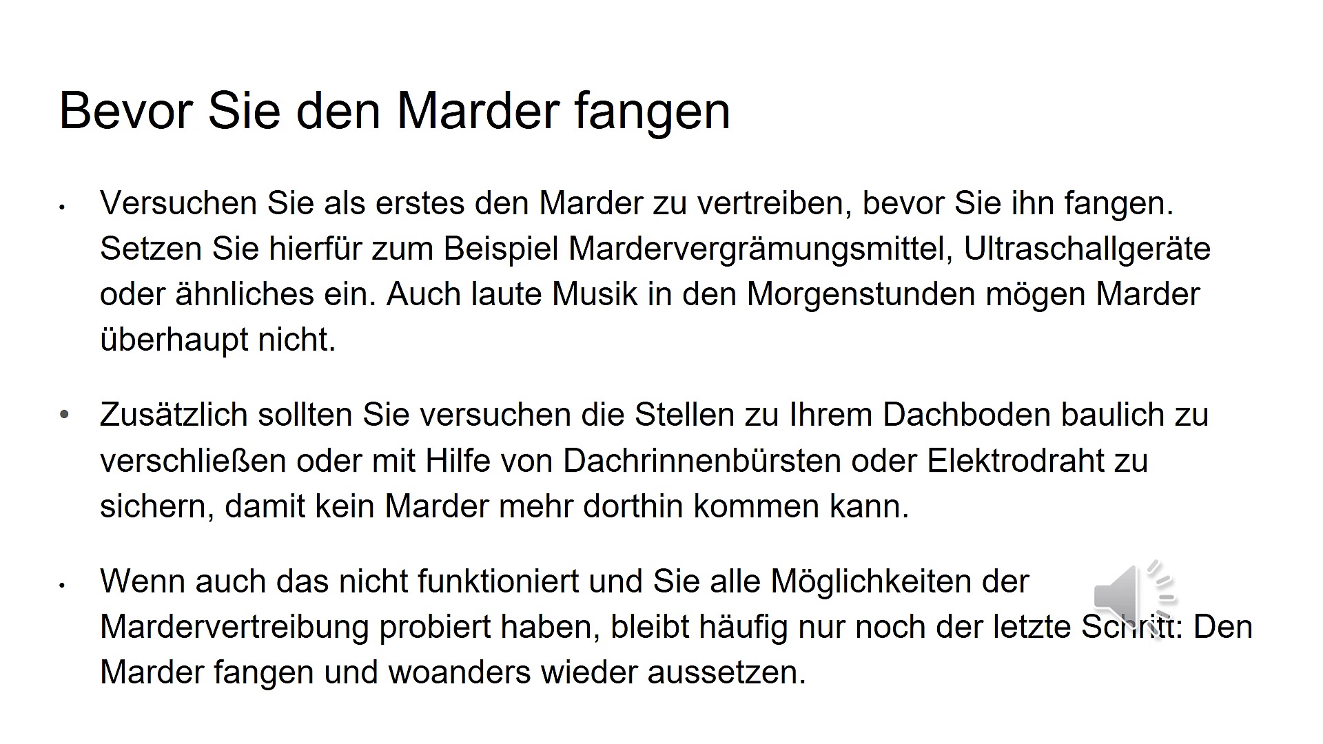 Wenn der Marder sich nicht vertreiben lassen will und hartnäckig ist, bleibt häufig nur den Marder zu fangen und woanders wieder auszusetzen. <br />Wie das funktioniert und worauf man achten sollte, sehen Sie hier im Video.