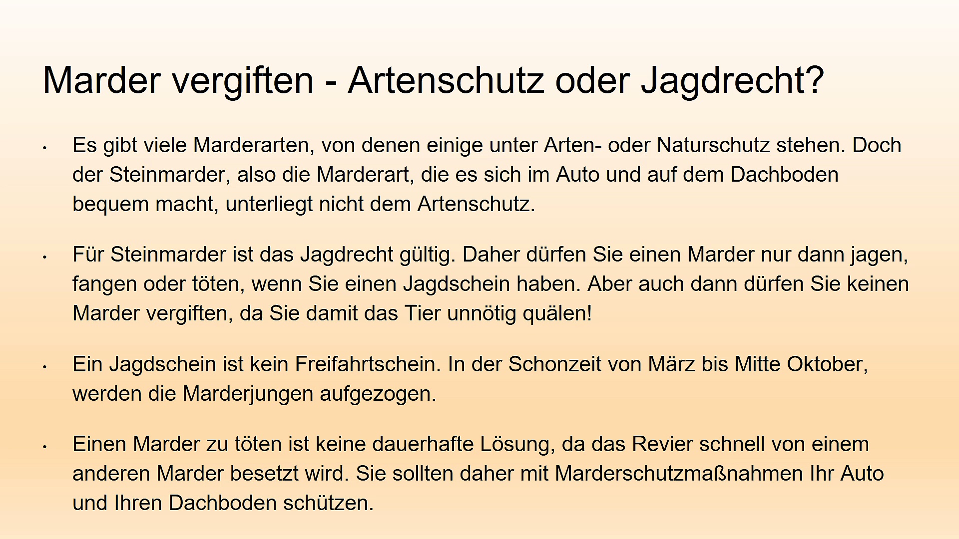Ein Marder kann einen ganz schön stören, wenn er im Auto alles anknabbert und Sie nachts nicht schlafen lässt, weil er auf dem Dachboden herum tobt. Da kann schnell der Gedanke aufkommen, das man den Marder umbringt. <br />Ob man das darf oder nicht, können Sie im Video sehen. Weitere Informationen finden Sie auch auf http://marder-vertreiben.org