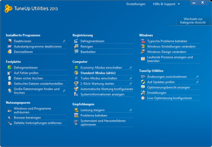 Mit TuneUp Utilities 2013 legt der beliebte PC-Optimierer eine verbesserte Version vor. Der Disk Cleaner findet jetzt noch mehr Datenmüll, der Browser Cleaner entfernt Surfspuren von Webbrowsern. Und mit einer Live-Optimierung optimiert TuneUp Utilities im Hintergrund laufende Prozesse automatisch für eine flüssigere Arbeitsgeschwindigkeit.