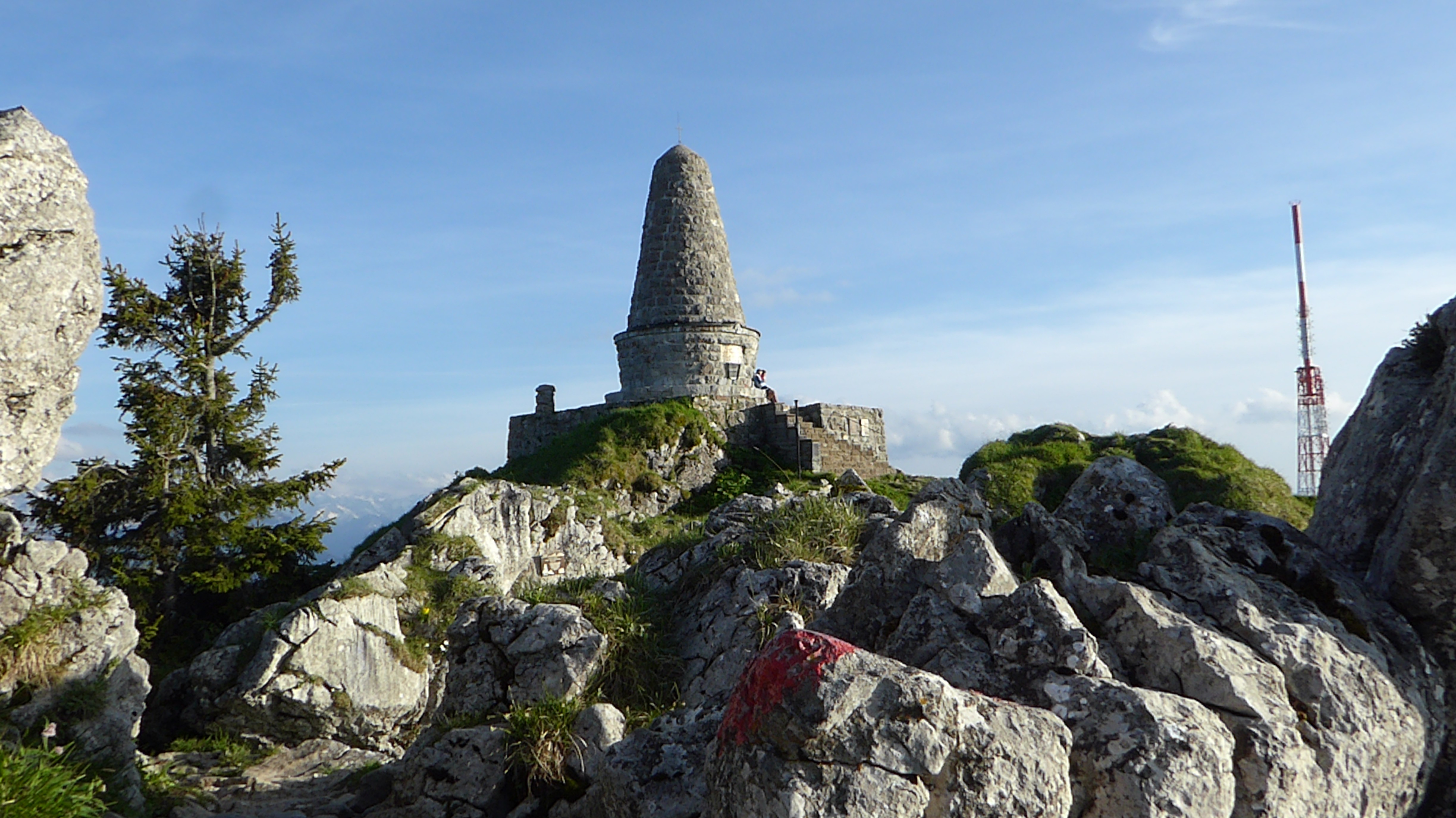 Vom gebührenfreien Parkplatz bei den Grüntenliften, laufen wir rechts über den "Lustigen Wanderweg" bis zur Jörgalpe. Von hier geht es hinauf zur Grüntenhütte, bevor der letzte steile Anstieg auf den Gipfel erfolgt. Die Strecke verläuft meist auf einfachem Bergweg (T2). Das letzte Stück zum Gipfel verlangt Trittsicherheit. <br /> <br />Oben angekommen beim Gebirgsjägerdenkmal, hat man eine großartige Aussicht auf die Allgäuer Landschaft, in die Schweiz im Westen bis zur Zugspitze im Osten. Der Sendeturm des Bayerischen Rundfunks auf dem Gipfelgrat des Übelhorn ist 94,5 Meter hoch.