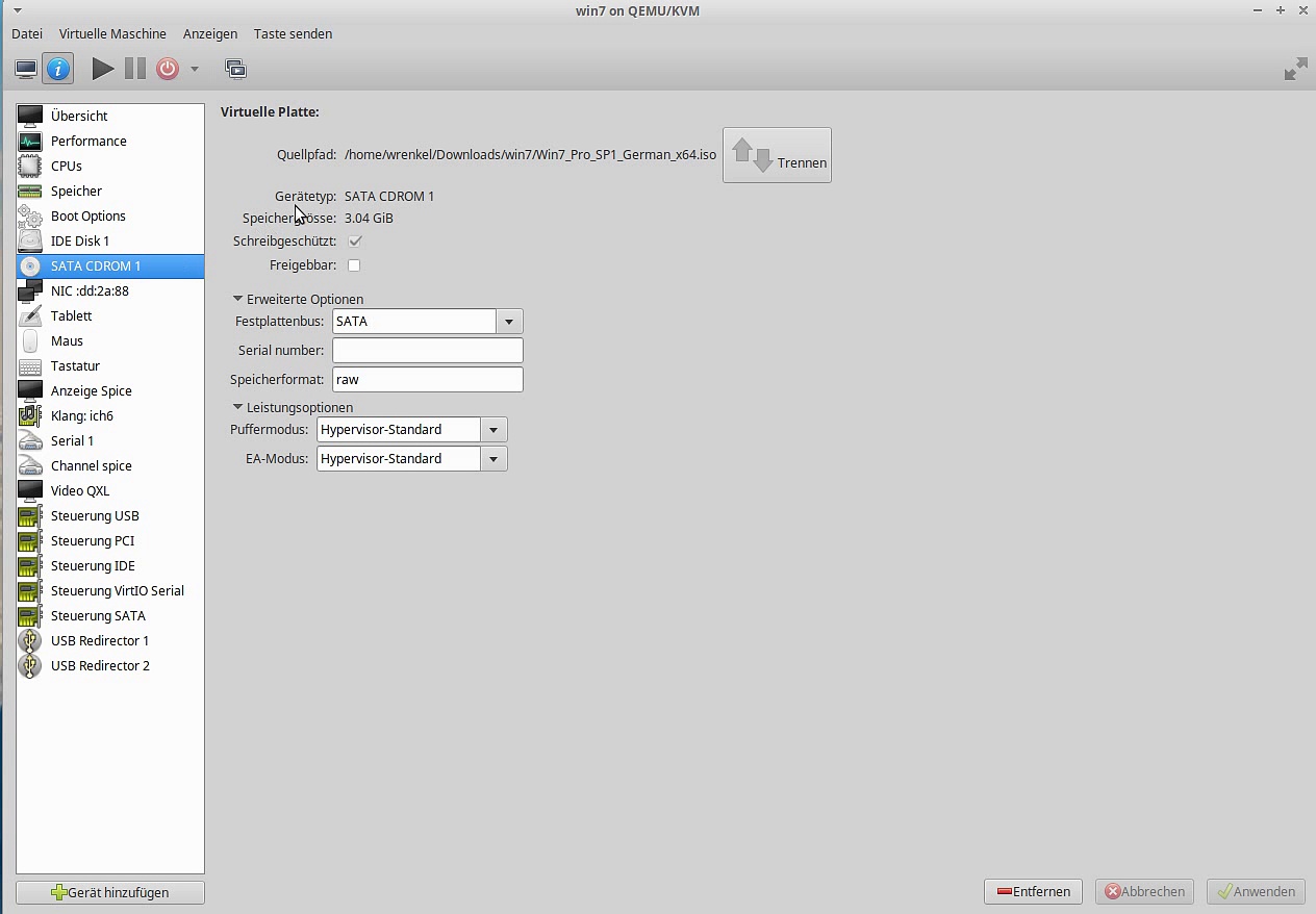 Der Versuch Windows 7 mittels Virtmanager Qemu / KVM als Gast in einem Xubuntu 16.04 64 Bit Host zu installieren scheitert leider.