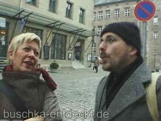 Von der zarten Unbekümmertheit ihres Hundes angelockt, kommt Buschka mit einer jungen Tschechin ins Gespräch. Doch sie läßt sich nicht erweichen, das erfolgreiche 2-Mann-Team mit nachhause zu nehmen… Die trotz Nebel tolle Aussicht von der Nürnberger Burg auf die Stadt entschädigt da enorm. Buschka übt sich als sympathischer Touristen-Fotograf, und schafft es mal wieder aus dem Nichts, einen hitverdächtigen Schlager zu erfinden. Und wie es sich für den 23. Dezember als Drehtag gehört, singt eine griechische Reisegruppe Buschka ein Weihnachtsständchen. Am Fuße der Burg hoppelt ein greiser Hund namens “Shakna” pflichtbewußt zu Frauchen, um eine Tüte mit Brötchen im Maul zu apportieren. Zirkusreif! Frauchen berichtet Buschka allerhand Internes zum “Nürnberger an sich”, und erzählt als Goldschmiedin vom harten Geschäft mit edlen Weichmetallen.