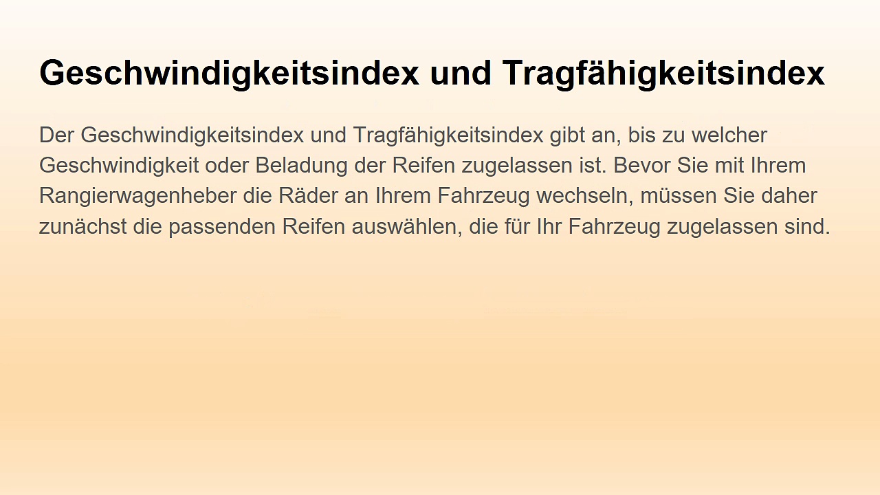 Der Geschwindigkeitsindex und Tragfähigkeitsindex gibt an, bis zu welcher Geschwindigkeit oder Beladung der Reifen zugelassen ist. Bevor Sie mit Ihrem Rangierwagenheber die Räder an Ihrem Fahrzeug wechseln, müssen Sie daher zunächst die passenden Reifen auswählen, die für Ihr Fahrzeug zugelassen sind. <br /> <br />Weitere Informationen zum Thema finden Sie auch unter http://rangierwagenheber-test.net