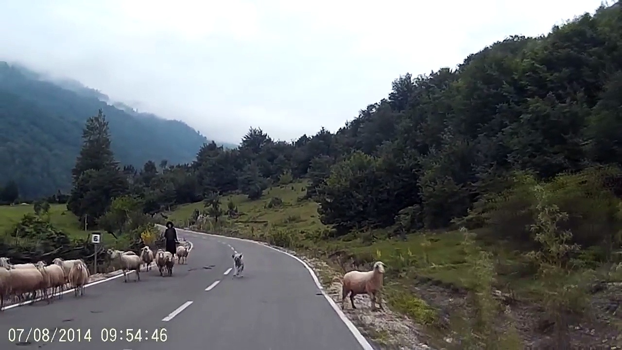 This guy was driving when he came across a herd of sheep and a shepherd. The sheep then began to run away and took the shepherd down with them. Just as the shepherd began to get up, one of the sheep rushed towards her and knocks her down. The driver then begins to honk his horn to get them all away
