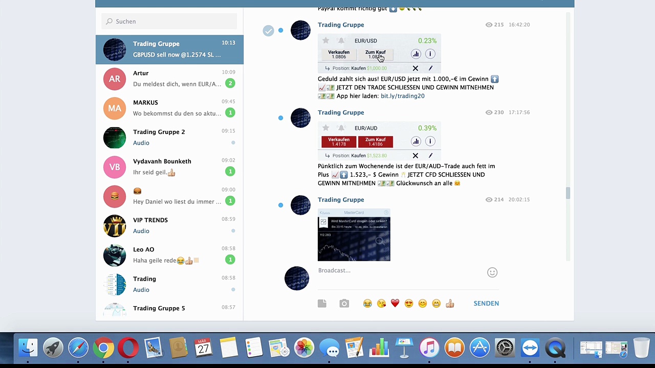 Am 27. März 2017 gab es einen schönen Aufwärtstrend bei GBP/AUD. Ich hatte den Trend bereits im Voraus an die Trader geschickt, da alle Indikatoren auf HOCH (KAUFEN) standen und der Trend charttechnisch gegeben war. In diesem Video zeige ich dir, wie ich den Trade bei einem Gewinn von 7.700,- EUR schließe. CFD-Konto eröffnen: http://bit.ly/trading20 Wenn du Trends haben willst, schreib mir bei WhatsApp! Du erreichst mich bei WhatsApp unter: +49 152 59 139 744 Allgemeine Risikowarnung: Der Handel mit CFD-Produkten oder Binären Optionen ist hochspekulativ. Entsprechende Transaktionen können mit einem hohen Risiko behaftet sein. Im Fall des Handels mit CFD-Produkten oder Binären Optionen kann der Anleger einen Teil seines Kapitals oder sein gesamtes investiertes Kapital verlieren.