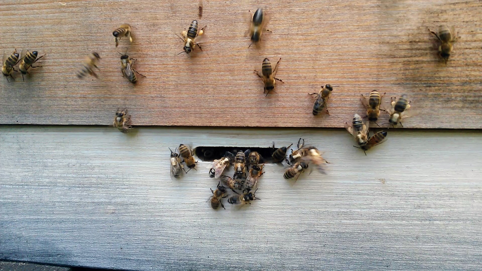 Nach dem Ausflug in die Springkrautfelder kehren die Bienen mit einem weißen Rücken zurück. Typisch für den Spätsommer/Herbst.