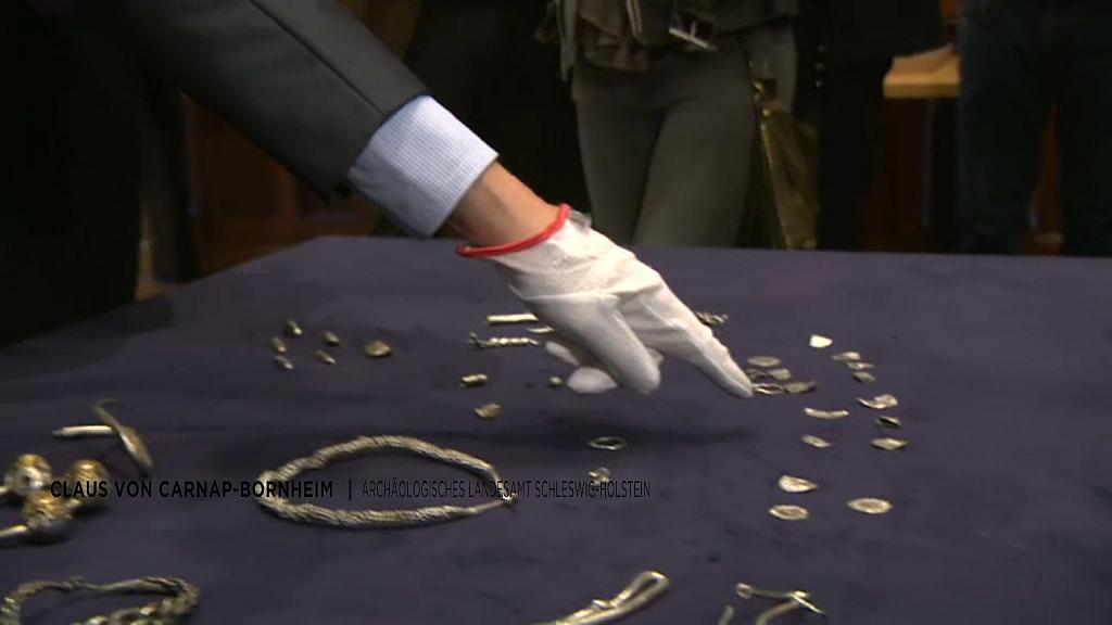 Im Sommer haben Archäologen auf einem Acker auf der Nordsee-Insel Sylt bei Morsum einen Silberschatz aus der Wikingerzeit (10. Jahrhundert) entdeckt. 180 Stücke, insgesamt rund ein Kilogramm schwer.<br /><br />Ein Fund aus vielen Zufällen – Schon vor Jahrzehnten hatte ein Landwirt auf einem Feld eine „Ringfibel“ aus Silber gefunden, ein Schmuckstück, mit dem Gewänder verschlossen wurden. Vor zwei Jahren schaltete die Familie ihren Hausarzt ein und der Archäologen aus Schleswig. Die fingen zu graben an. Dabei entdecken sie auch die zu der Ringfibel passende Nadel.<br /><br />Den Wert des Silbers geben die Archäologen mit dem Wert von 23 bis 25 Ochsen an. Heute ist der Schatz unbezahlbar und reif fürs Museum.<br /><br />Kulturministerin Karin Prien (CDU) bekam den Silberschatz vom Acker von Claus von Carnap-Bornheim vom Archäologischen Landesamt präsentiert. “Besonders die Wikingerzeit ist im Norden in vielfältiger Weise durch Gräber, Burgen und Siedlungen vertreten. Das Bild wird nun ergänzt durch diesen reichhaltigen Hortfund, der uns sicher noch vieles über die Menschen dieser Zeit erzählen kann.” Das Archäologische Landesamt hofft, die Fundstücke schon bald einer breiten Öffentlichkeit zeigen zu können. Auch im Sylter Heimatmuseum soll zumindest die Gewandfibel ausgestellt werden.<br /><br />su<br />