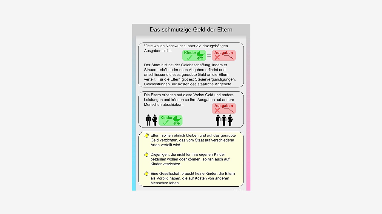Das schmutzige Geld der Eltern - Kindergeld <br /> <br />Themenbereich: <br />Abgaben, Babywunsch, Ehepaare, Eltern, Elterngeld <br />Erziehungsgeld, Familie, Familienbeihilfe, Familienkasse <br />Familienleistungen, Familienplanung, Familienpolitik <br />Familienzulagen, Geburt, Kinder, Kinderbetreuung <br />Kinderfreibetrag, Kindergeld, Kinderlose, Kinderlosensteuer <br />Kinderlosigkeit, Kindertagesstätte (Kita), Kinderwunsch <br />Kinderzulagen, Mutter, Mutterschaft, Nachwuchs, Paare <br />Schwanger, Schwangerschaft, Singles, Sozialleistungen <br />Sozialsysteme, steuerlichen Freibeträge, steuervergünstigungen <br />Vater, Vaterschaft, Wunschkind, Zwangsabgabe, Zwillinge