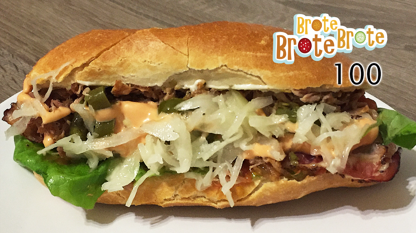 Zur Feier der 100. Folge "Brote Brote Brote" gibt es heute ein richtig zünftiges Sandwich im Baguette-Brötchen: Das Schmelzkäse-Pork-Sandwich. Mit Raclette-Bacon, Bruscetta, Jalapenos, Krautsalat, Cocktail-Sauce und natürlich Schmelzkäse und Pulled Pork.