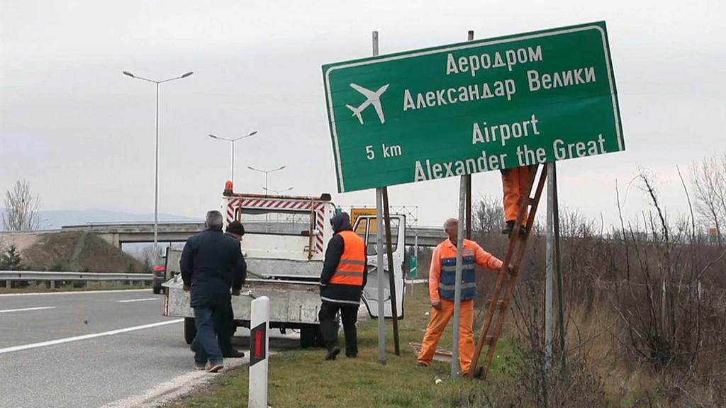 Mazedonien baut Verkehrsschilder mit dem Namen Alexanders des Großen ab. Der Hauptstadt-Flughafen soll umbenannt werden. Griechenland bemängelt, der Name "Mazedonien" sei verknüpft mit einem Anspruch auf die gleichnamige griechische Provinz und deren historisches Erbe, zu dem auch Alexander gehöre<br />