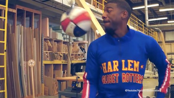 Die Basketballer der Harlem Globtrotter sind für ihre Tricks bekannt. In diesem Versuch löst einer mal eben eine ganze Kettenreaktion aus. Teampartner waren die Studenten des Georgia Tech College.