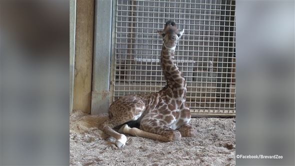 Ein knapp drei Wochen alter Giraffen-Bulle aus Florida will sich kein Geräusch entgehen lassen und wackelt deshalb ununterbrochen mit den Ohren.