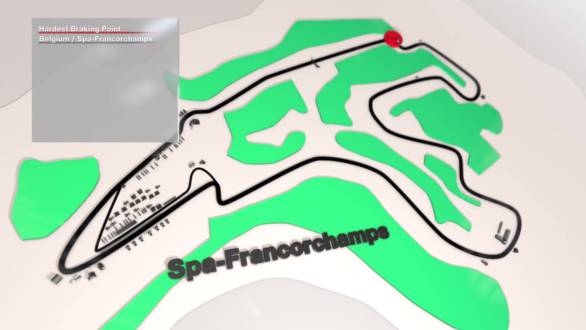 Der härteste Bremspunkt auf dem "Circuit de Spa-Franchorchamps" liegt vor der 5. Kurve. Der Fahrer muss hier um 143 km/h auf nur 89 Metern runter bremsen. Die freigesetzte Bremsenergie beträgt 1,946 kW und auf den Fahrer wirken 4.6 g während er mit 137 kg auf die Bremse drücken muss.