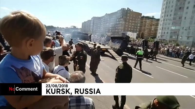 Der Vorfall wurde von einem Zuschauer gefilmt, der an einer Militärparade anlässlich des 75. Jahrestages der Schlacht um den Zweiten Weltkrieg in Kursk teilnahm.