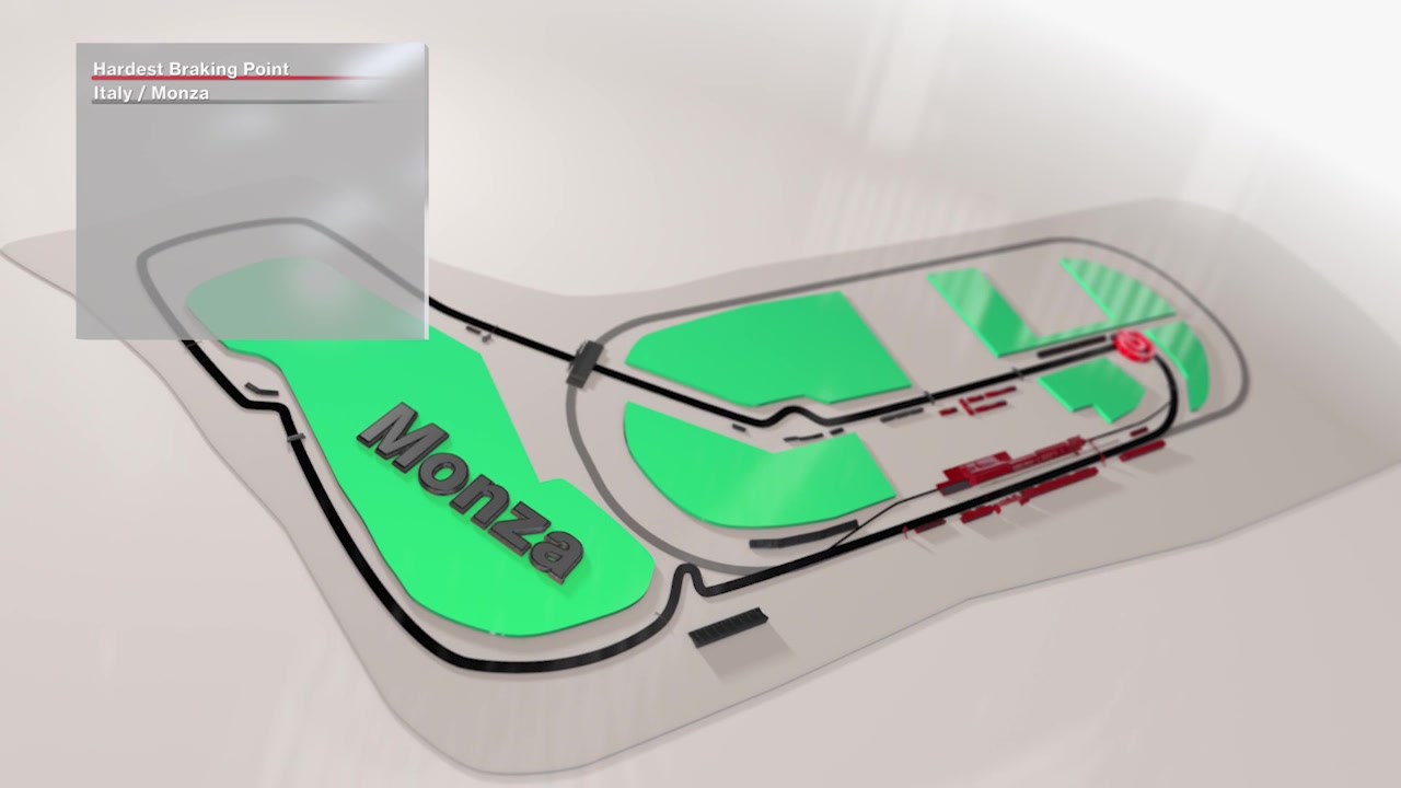 Der härteste Bremspunkt auf dem "Autodromo Nazionale Monza" liegt vor der 11. Kurve. Der Fahrer muss hier um 109 km/h auf nur 72 Metern runter bremsen. Die freigesetzte Bremsenergie beträgt 3,010 kW und auf den Fahrer wirken 6.7 g während er mit 211 kg auf die Bremse drücken muss.