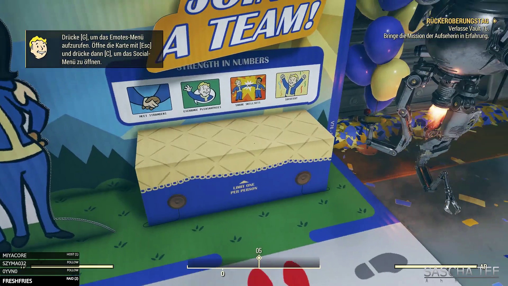 Fallout 76: Rückeroberungstag. Wir schreiben das Jahr 2102. 25 Jahre, nachdem die Bomben abgeworfen wurden, steigen Sie aus Ihrem Vault und erblicken zum ersten Mal das postnukleare Amerika. Ausgewählt als Beste und Klügste dieses Landes obliegt es Ihnen – alleine oder zusammen –, das Ödland zu erkunden, wieder aufzubauen und gegen die größten Bedrohungen zu verteidigen.<br />Bei diesem Online-Prequel ist jeder menschliche Überlebende ein Spieler, mit dem Sie zusammenarbeiten können – oder auch nicht –, um zu überleben. Denn die bislang größte, dynamischste Welt im Fallout-Universum sieht sich der nuklearen Auslöschung gegenüber. <br /><br />Genre: Abenteuer, Action, MMO<br />Entwickler: Bethesda Game Studios<br />Publisher: Bethesda Game Studios<br />Veröffentlichung: 14.11.2018<br />Offizielle Seite: https://fallout.bethesda.net/games/fallout-76<br /><br />Weitere Lets Plays: https://saschatee.de