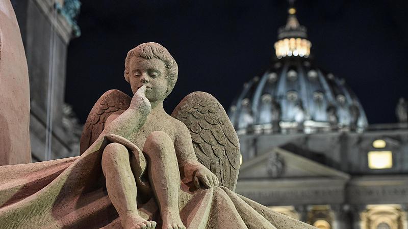 Im Vatikan hat ein Künstler eine Krippe mit Engeln, alles aus Sand gebaut.