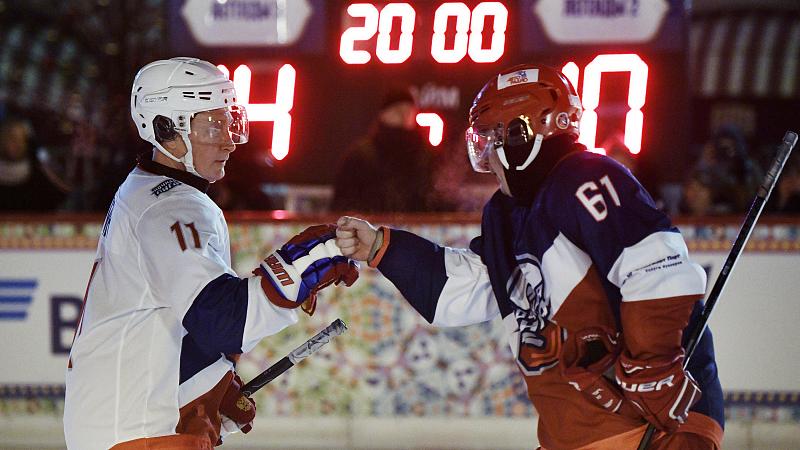 Auf der Traditionseisbahn vor dem Kaufhaus GUM trug sich der russische Präsident gleich fünf Mal in die Torschützenliste ein. Sein durch Altstars verstärktes Team gewann 14:10.